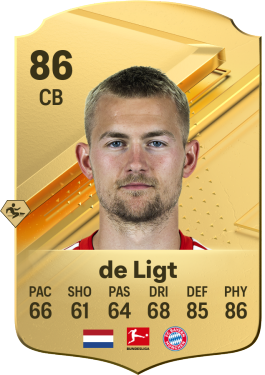 In the context of the video game EA Sports FC 24, which was developed by EA Sports, Matthijs de Ligt, who is currently playing for Bayern Munich, has been given an overall rating of 86. This rating was given to him in the context of the game. Because of the circumstances of the game, he was given a rating that was established by those circumstances. During the course of this season, he has played the position of center back in a total of twenty-one matches. According to the statistics that he has compiled, he has scored two goals and assisted on one more. Moreover, he has experience playing the position of center back in the past. Additionally, he has previous professional experience playing the position of center defense. He has played this position in the past. His overall rating is approximately 6.91, and his average rating for matches that involve center back is approximately 6.91. His rating can be found in the previous sentence.